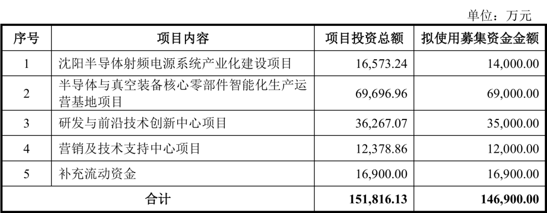 此次IPO,恒运昌拟募资14.69亿元,主要运用在沈阳半导体射频电源系统产业化建设项目、半导体与真空装备核心零部件智能化生产运营基地项目、研发与前沿技术创新中心项目、营销及技术支持中心项目、补充流动资金。